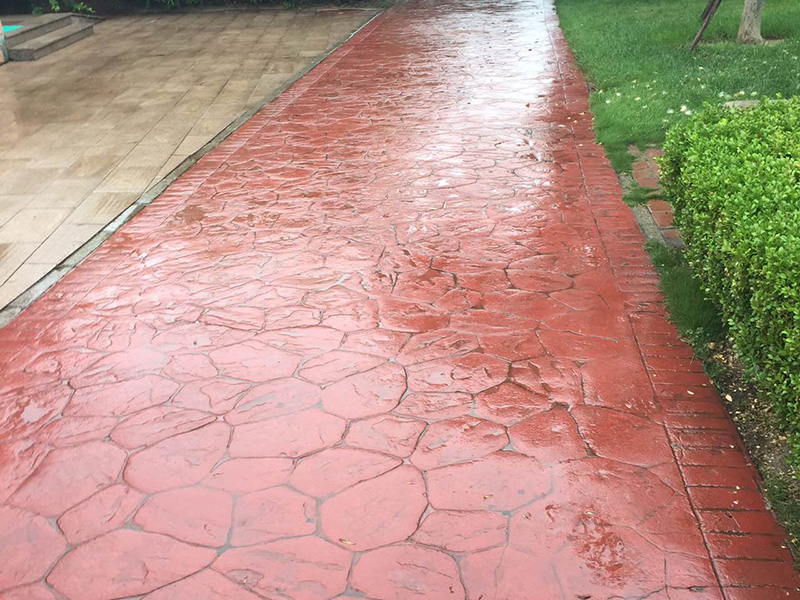4.彩色脫模粉處理:施工的表面均勻拋撒彩色脫模粉,將整個(gè)表面覆蓋,同時(shí)在模具的表面也上一些脫模粉;